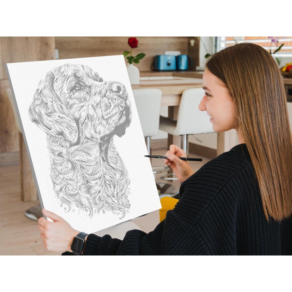 Készíts dizájner festményt pöttyökkel! Válassz egy filctollat a kedvenc színedben, és pöttyözz kedvedre az előre nyomtatott vászonra! Ha kerettel rendeled meg a képedet, már fel is akaszthatod a falra, ha elkészült. Az biztos, hogy lenyűgöző művészi alkotást kapsz a végén, akkor is, ha soha nem festettél még. Minden egyes pöttyel egy lépéssel közelebb vagy az egyedi alkotásodhoz.